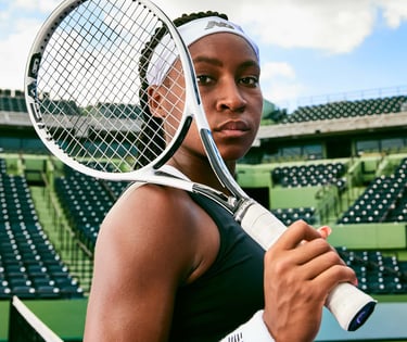 Esta idea de la co-autoría nos permite elevar la voz del atleta y ya sabes, lo que sea que sea importante para él o ella, queremos asegurarnos de que así sea, por eso estamos ayudando con eso. Y debido a que tenemos tantos embajadores afroamericanos como Coco Gauff, que es la joven fenómeno de diecisiete años que es, y no solo es un fenómeno en el tenis, es un fenómeno en la cultura, quería hablar sobre esto y quería a New Balance para ayudarla.